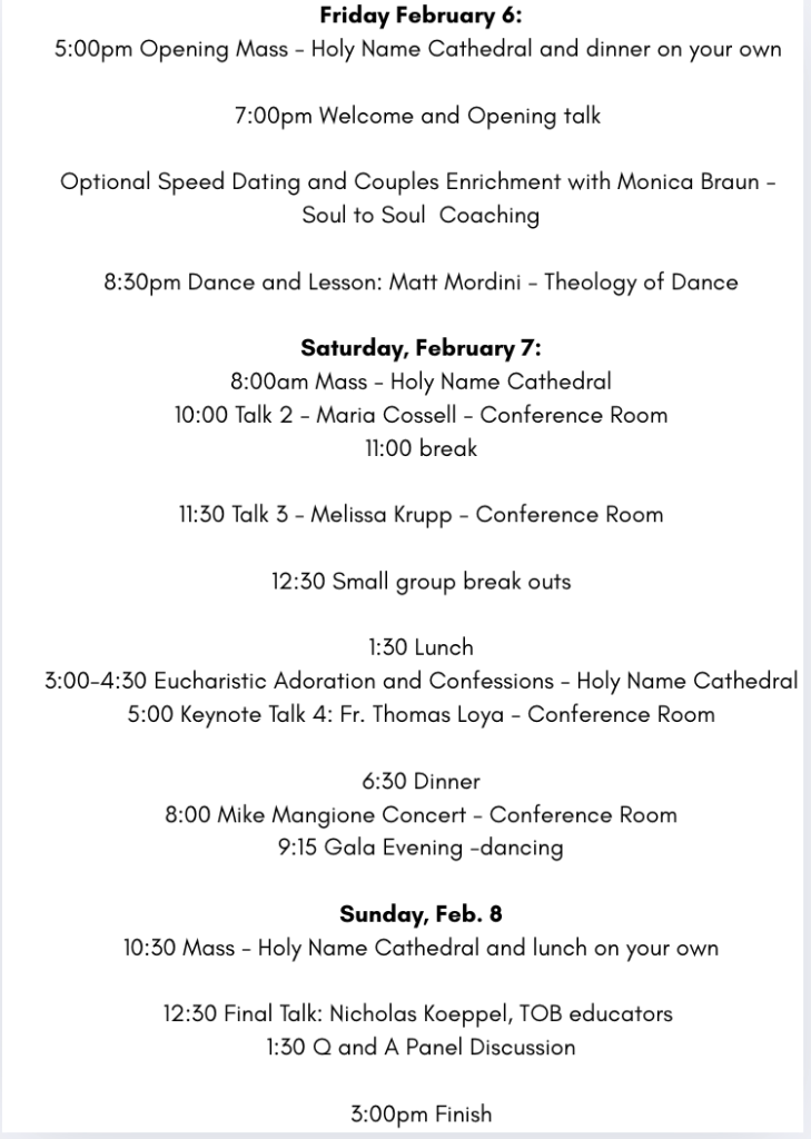 Friday night will begin with check in at the hotel, a Speed Dating Event hosted by Monica Braun (Soul to Soul Coaching) and two hours of dance taught by Matt Mordini (Theology of Dance). On Saturday night, Mike Mangione will host a concert during a gala.